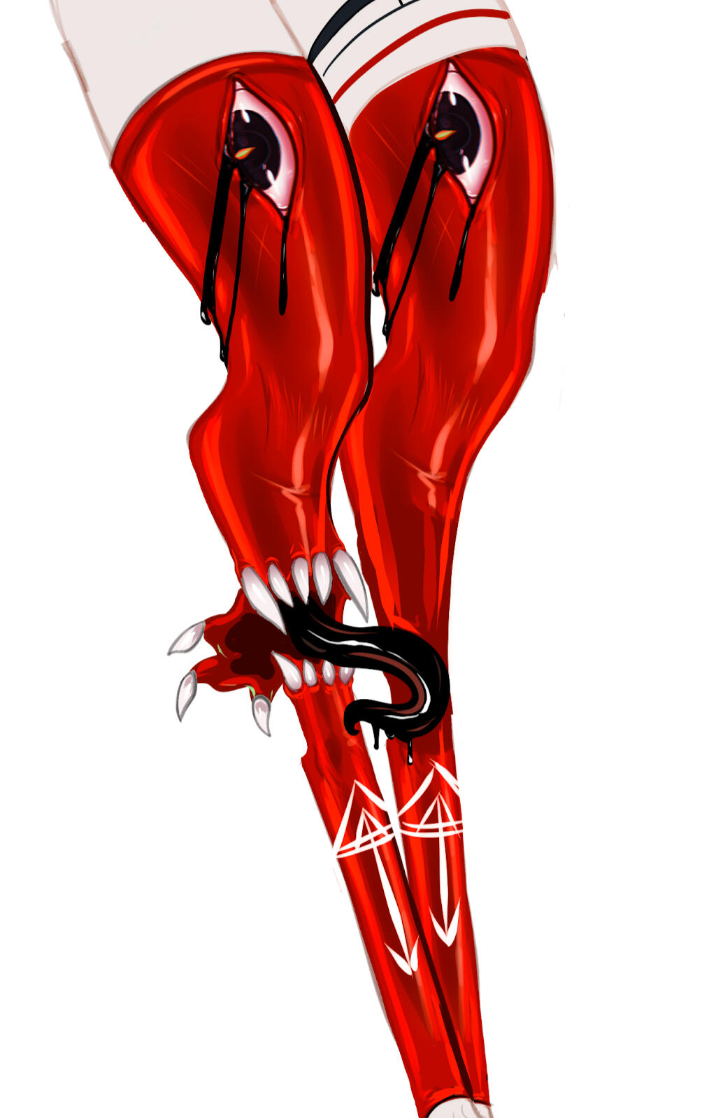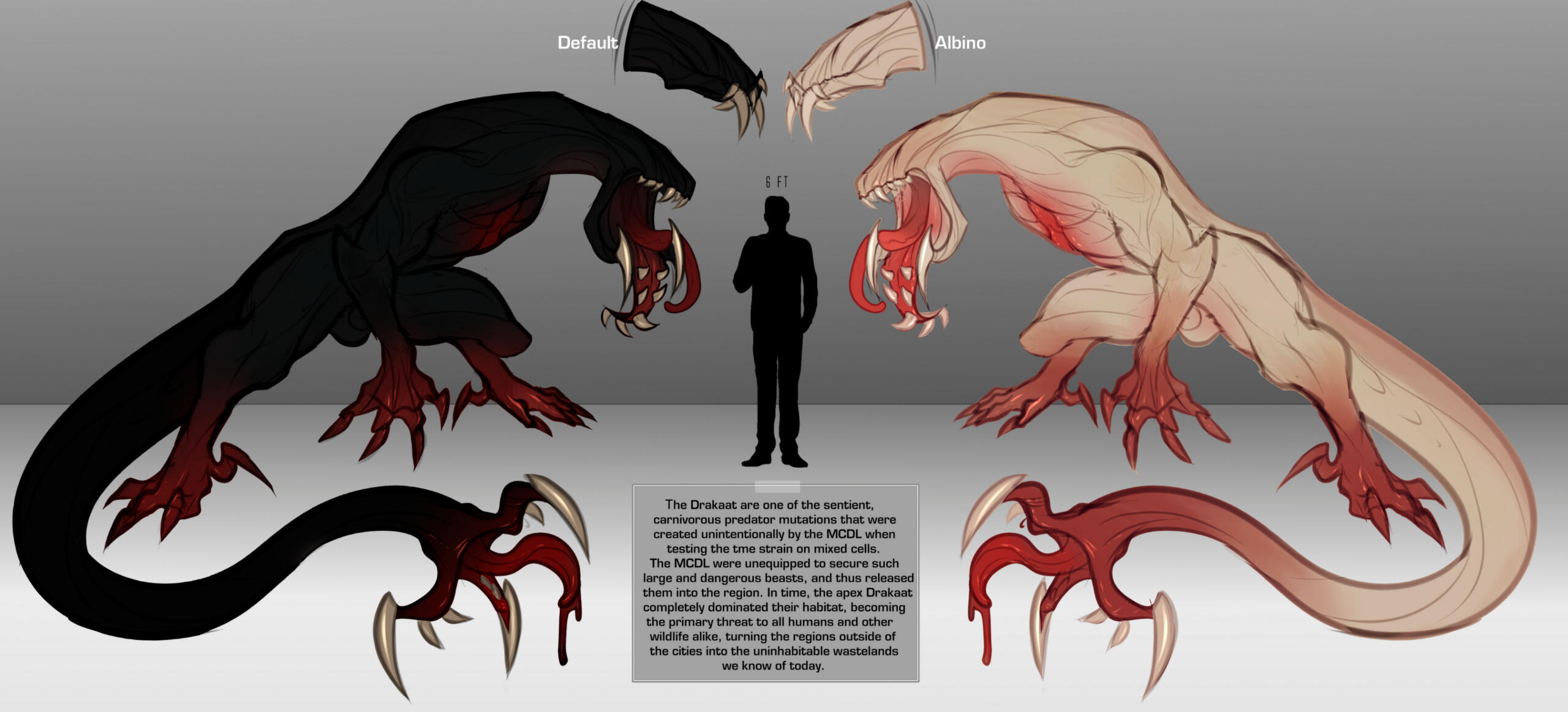 As stated above, growths and appendages can retract back into the hosts body, their iris and pupils will also revert. This makes mutated human hosts almost impossible to tell apart from non-infected.This rule is only overridden by grievous, extreme or life-threatening wounds sustained AFTER the virus has infected a host. When this uncommon criteria is met, the wounds are almost immediately transformed into a TME zone as the parasite tries to preserve the host, and it's own life / functionality to that body part. These new zones are entirely owned by the parasite, the host having no control over them, this makes them far more reactionary, unable to be retracted or hidden, and are extremely volatile.Quite commonly, human TME hosts have jaw flays in any extension starting from the hosts teeth and jutting outwards to create a new jaw appendage. These are usually not much bigger than the head. In rarer cases, the flay extends far beyond their regular size.Their pupils become lighter when any zone is active, giving off a slight glow and looking almost "blind". Parasite infected eyes are far more light sensitive than usual, but grant the host a new layer of tissue (tapetum lucidum) in the eye that reflects visible light back through the retina, increasing the light available to the photoreceptors. This grants a weak and blurry night vision for the host and reflective eyes in the dark.